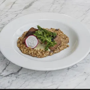 Punta picana cocinada lentamente en su jugo (18 horas) con verduras y hierbas, montada sobre un risotto funghi trufado, bañada con salsas de queso azul y reducción de vino tino y demi glace.